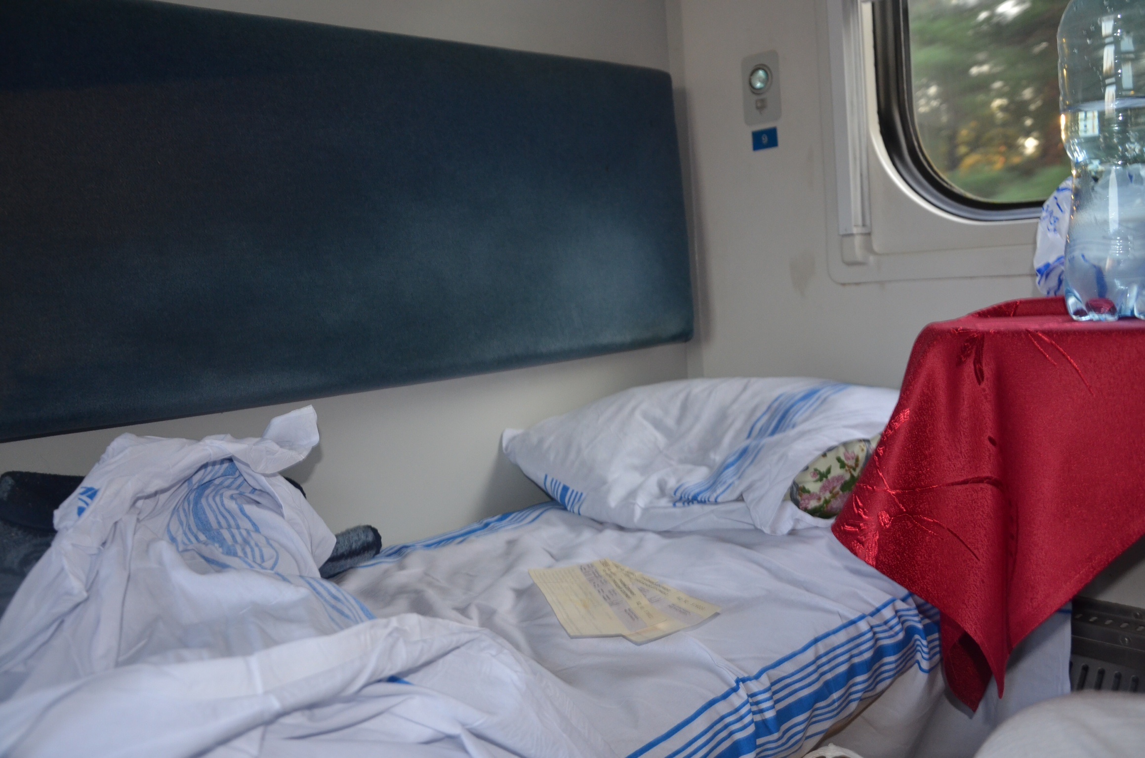 We’ve got company. In the top bunkers are a mum, and daughter, the same age as my little one. She is a brunette; hair neatly swept up into a cute ponytail, granite eyes flashing; she starts her conversations in a friendly fashion, hand stretched out with a memorized, “Hello, my name is Natasha, what is your name?” Every other question, attempts in conversation gets the introductory hello. Ukraine Railways are quite cool, providing packaged clean sheets, pillows, blankets for a snug sleep.